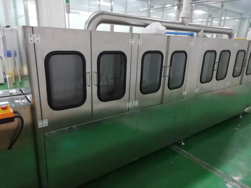 1:此設備為圓柱電池外殼清洗機。主要應用于電池成本組裝線,將封口后的圓柱電池通過輸送帶經清洗,烘干工序后流出連接下工序。